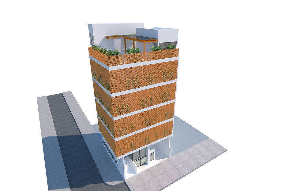 Về hình thức cũng như chức năng, các viên gạch bông gió được xây làm hai mặt tiền, đóng vai trò thẩm mĩ cũng như giải quyết vấn đề khí hậu, bên sau của hai tấm mặt đứng này như đã giới thiệu là ban công và bồn cây thì trồng những cây nhỏ và dây leo sao cho phù hợp với khoảng trống cho phép.