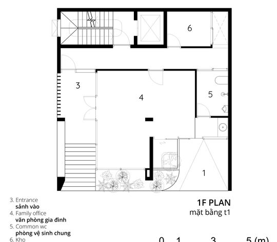 Với yêu cầu bố trí nhiều công năng trên một thửa đất 10m x 10.5m, kiến trúc sư không thể tạo ra một khoảng sân cho ngôi nhà, tuy nhiên người thiết kế đã cố gắng tạo ra các không gian chung với cây xanh. Ở các hướng tiếp xúc với hai tuyến giao thông là đường phố và ngõ, một ban công kết hợp với máng trồng cây bao quanh hai mặt này. Màu xanh lá cây ở sơ đồ trồng cây xanh trên các tầng cho thấy rằng từ tầng 2 đến tầng 4 đều có ban công rộng với cây xanh. Đến tầng 4 và 5 thì ban công được điều chỉnh trở thành các khoảng tê-rát rộng rãi để nghỉ ngơi thư giãn (ghi chú: tê-rát = terrace - không phải sân tự nhiên mà sân được tạo ra do kết cấu của nhà)