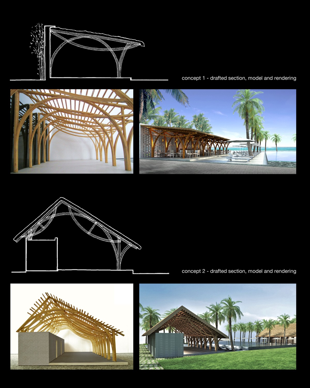 Các khung tre được sử dụng cho công trình đều được xử lý tự nhiên tại chỗ. Quá trình này bao gồm uốn bằng lửa, ngâm trong nước và khử trùng. Quá trình này mất 4 tháng để đạt được chất lượng tre tốt hơn. Sau quá trình này, các khung được đúc sẵn trên mặt đất giúp tăng độ chính xác của từng khung và giảm thời gian thi công. Phương pháp xây dựng này đã được chứng minh là rất hiệu quả và việc kiểm soát chất lượng trong quá trình xây dựng dễ dàng hơn nhiều. Vật liệu lợp mái là mái lá tự nhiên (cây vọt). Chất liệu này tạo nên hình ảnh rất nhiệt đới cùng với cảnh quan xanh xung quanh tòa nhà làm tăng thêm bầu không khí thư thái cho khu nghỉ dưỡng.
