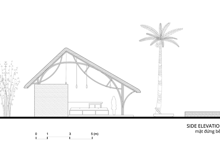 Phần bao che của quán được thiết kế bằng tre và đá. Khối dán đá là các kho chứa và các tiện ích phụ trợ. Cấu trúc chính của mái dốc được tạo bởi 8 khung tre. Mỗi khung bao gồm những cây tre cong và thẳng được kết nối với nhau bằng chốt tre và dây buộc. Dãy các khung này vuông góc với bãi biển, do vậy mà cho phép gió mát từ biển thông suốt qua toàn bộ quán.