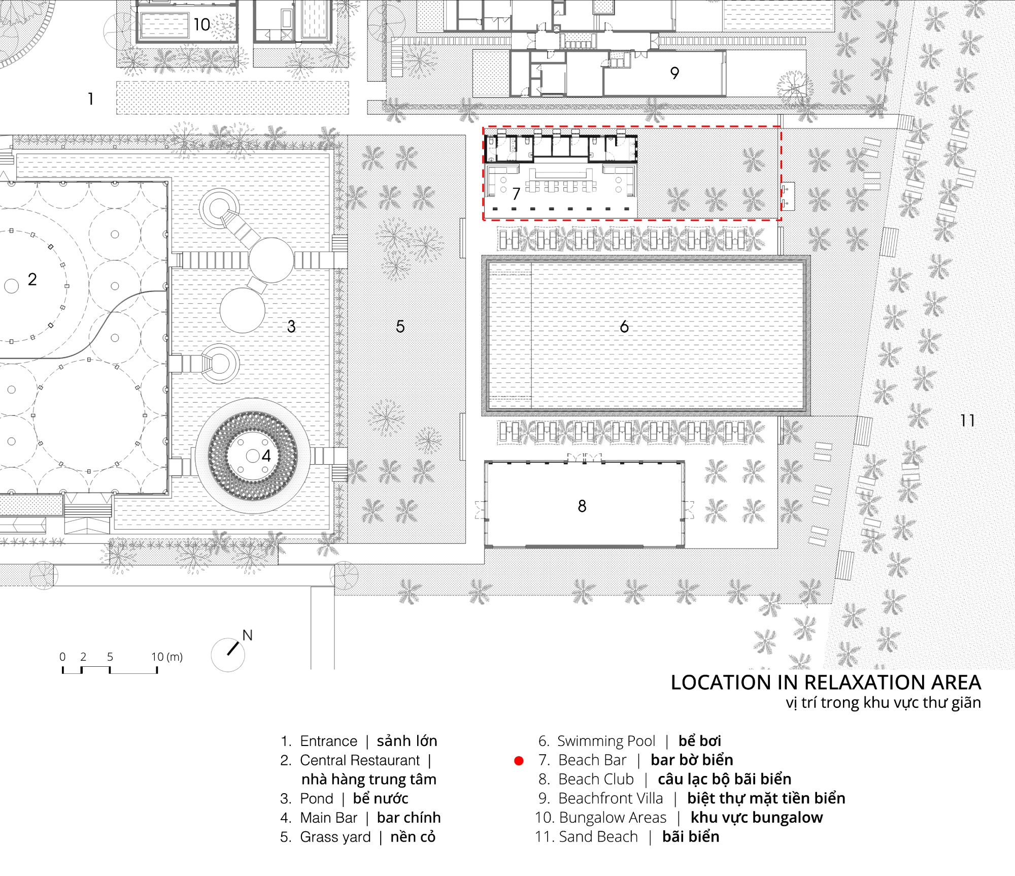 Trên bản đồ tổng mặt bằng, công trình được bố trí ở vị trí có thể ảnh hưởng tới xung quanh. Khi dự án vừa mới phác thảo, Bar Bờ Biển được cho rằng bên cạnh việc kết hợp với Câu Lạc Bộ Bãi Biển (beach club) và Bể Bơi Trung Tâm (central swimming pool) để phục vụ khách tham gia trong khu giải trí quanh hồ bơi, bản thân Bar Bờ Biển phải có khả năng gây được sự chú ý của du khách đến từ bãi biển cũng như người từ các bungalow, khách sạn, nhà hàng trên đường ra bãi biển. Nó được mong đợi là một điểm dừng tốt. Lúc đầu, phác thảo 1 được đề xuất có cấu trúc gần như bằng tre toàn bộ với chỉ một bức tường đá làm mặt tiền phía sau giúp giữ cho phần tre khỏi gió mạnh. Tuy nhiên, sau đó khách hàng đã yêu cầu kiến trúc sư bổ sung thêm diện tích làm kho, wc và phòng kỹ thuật. Do vậy phác thảo 2 đã được đề xuất thay thế, với một khối bổ sung xây bằng khung bê tông và tường gạch với đá ốp hoàn thiện, nhằm đáp ứng các chức năng đó. Đề xuất này đã được lựa chọn và phát triển, trở thành công trình thực sự của khu nghỉ dưỡng hiện nay.