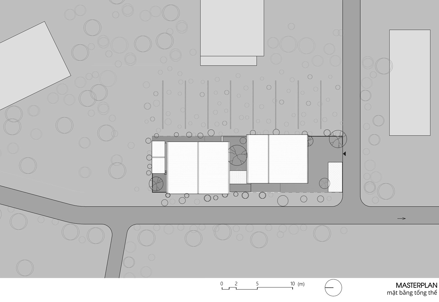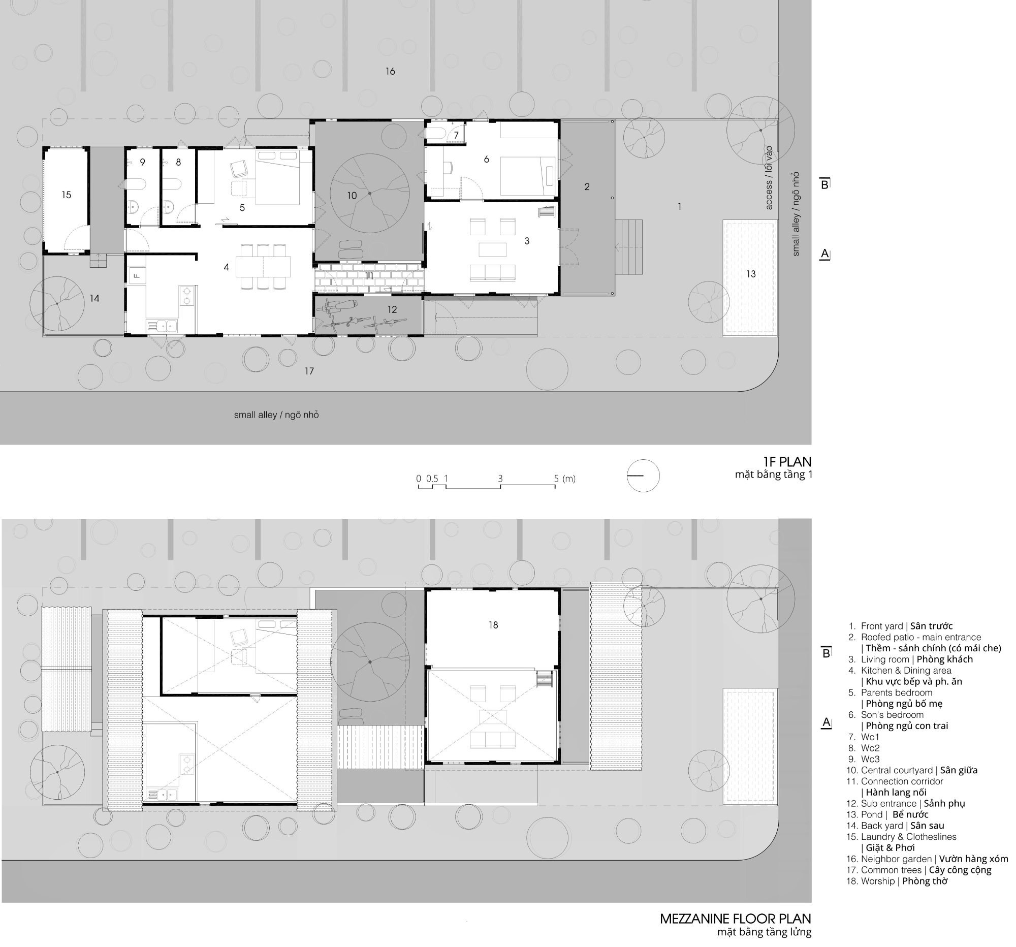 Việc bố trí hai khối chính tách riêng bởi một sân trung tâm tạo ra các khoảng trống xen kẽ và rải rác vì đồng thời cũng có những ô đất trống ở các mặt khác của các khối này, cho phép gió đi qua các không gian này rồi thổi vào các khu vực bên trong. Từ hai khối không gian chính này, các thành viên trong gia đình có thể ngắm nhìn quang cảnh xung quanh nhà hoặc ngoài sân, nơi cũng có thể là nơi vui chơi cho trẻ nếu chúng không muốn tổ chức quá xa hoặc bố mẹ chúng không cho phép chúng rời khỏi nơi ở.