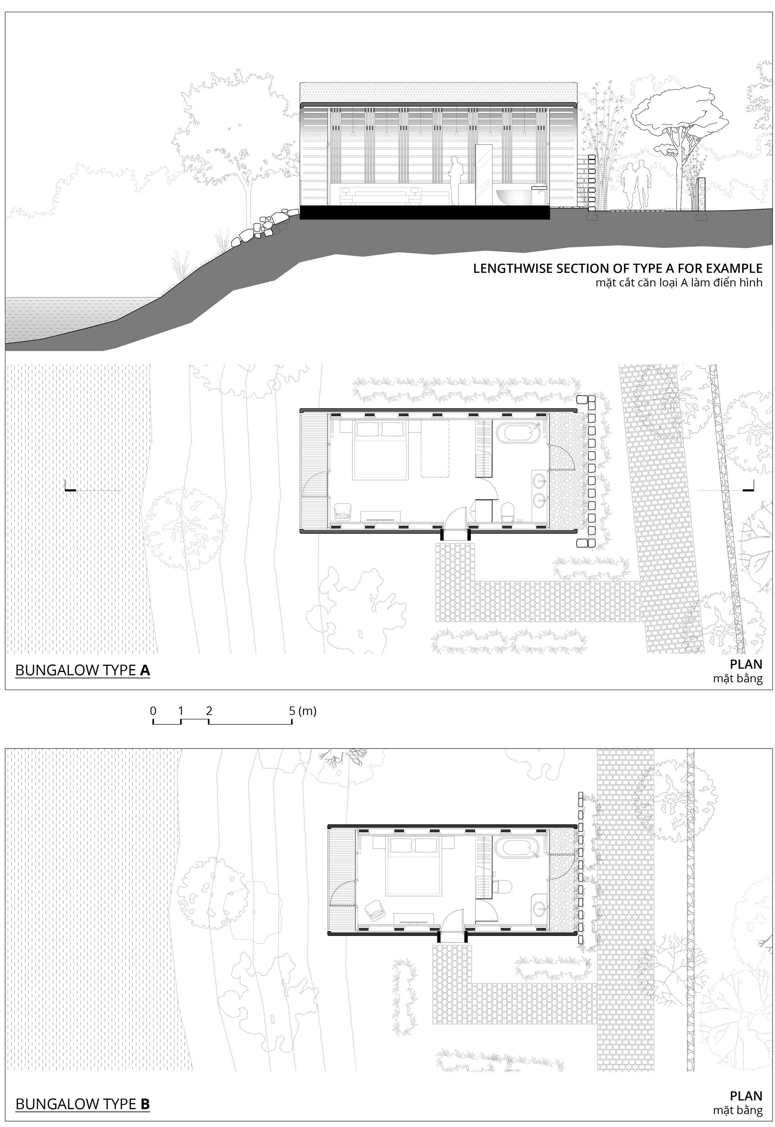 Bungalow về nguyên thủy là một căn nhà nhỏ một tầng có sân, phòng khách và phòng ngủ nhưng đúng như tiêu chí của dự án, các bungalow ở đây được tiện giảm tối đa, chỉ gồm một phòng ngủ tích hợp với phòng tắm, cùng với hiên nhỏ, nhằm hướng đến việc phục vụ tầng lớp khách hàng trung lưu, với giá lưu trú phải chăng. Việc này cũng phù hợp với diện tích và hình dáng của thửa đất này; theo đó, các nhà thiết kế và khách hàng thống nhất bố trí được 20 căn, chia làm hai loại: loại A có diện tích sàn sử dụng 33.7 m2 còn loại B có diện tích sàn sử dụng là 25.7 m2. Các căn bungalow này được thiết kế với kết cấu tre và mái lá (rơm, vọt) nhằm mang lại sự gần gũi cho khách lưu trú, chính là những tính chất và đặc điểm mà người thành phố thường tìm kiếm cho mỗi kỳ nghỉ của họ. Mặt trước do đó không có tường bao che mà toàn bộ là vách kính được thiết kế khít với đường bao mặt đứng, nhằm đem lại độ mở tối đa khi ngắm nhìn cảnh quan phía trước.