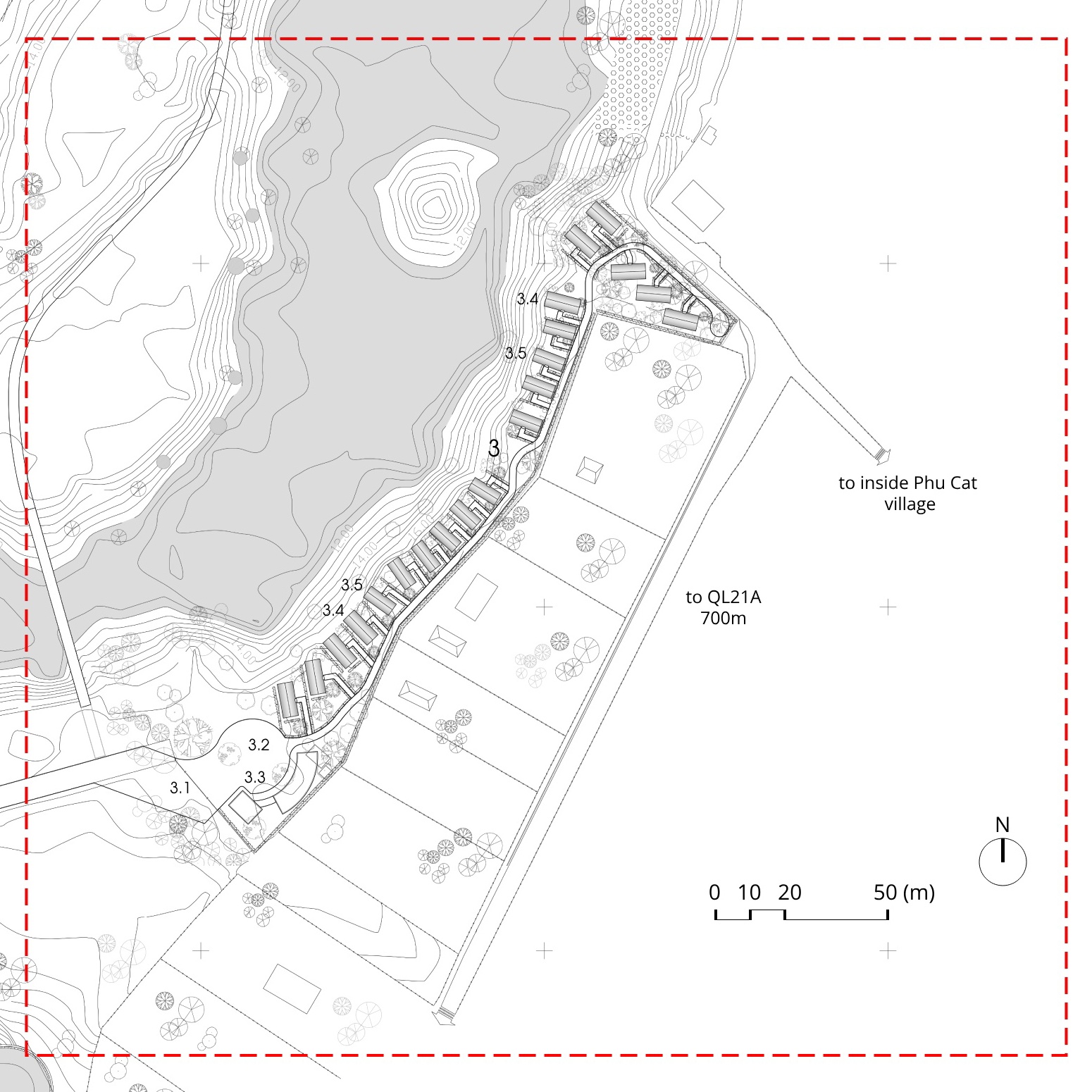 Khu bungalow này nằm trong một tổng thể lớn hơn của La Vong Eco Resort. Theo đó, du khách ngoài việc nghỉ ngơi và tham quan ở đây, họ sẽ tham quan, tận hưởng thêm cho kỳ nghỉ ở các dịch vụ khác trong khu nghỉ dưỡng, như trên tổng mặt bằng quy hoạch đã định hướng. Tuy vậy, nội bộ trong khu vực này, chúng tôi đã cố gắng đưa vào các không gian cho mặt cỏ và cây xanh, chủ yếu bố trí xen kẽ giữa các căn nhà, ở những khoảng đất nở rộng của dải hẹp này, cũng như phía trước sát mặt hồ. Ngoài ra, sự kết hợp vật liệu mái lá, tre và đá lát, sự xen kẽ cây xanh với khối ở và các lối đi là ý đồ thiết kế cảnh quan đáng ghi nhận, góp phần tạo hình hài cho tiểu khu này. Riêng phần đất sát mặt hồ phía trước các bungalow, chính là phần có diện tích thay đổi như trong giới thiệu thống kê ở phần đầu về sự dao động của mật độ xây dựng. Điều này chính là do sự thay đổi của cao trình mặt nước. Mặt nước dâng cao đồng nghĩa với việc thửa đất hẹp hơn. Tuy vậy, phần chân của bờ dốc cũng được dự định trồng các loại cây đặc biệt có thể sống tốt khi thân cây ngâm dưới nước (cây bán ngập). Do vậy mà phần bờ dốc này cũng được xanh hóa toàn bộ, để làm mát tầm mắt của khách lưu trú khi họ nhìn ra mặt nước cũng như hướng sang phía bên kia hồ là các dịch vụ khác của khu resort.